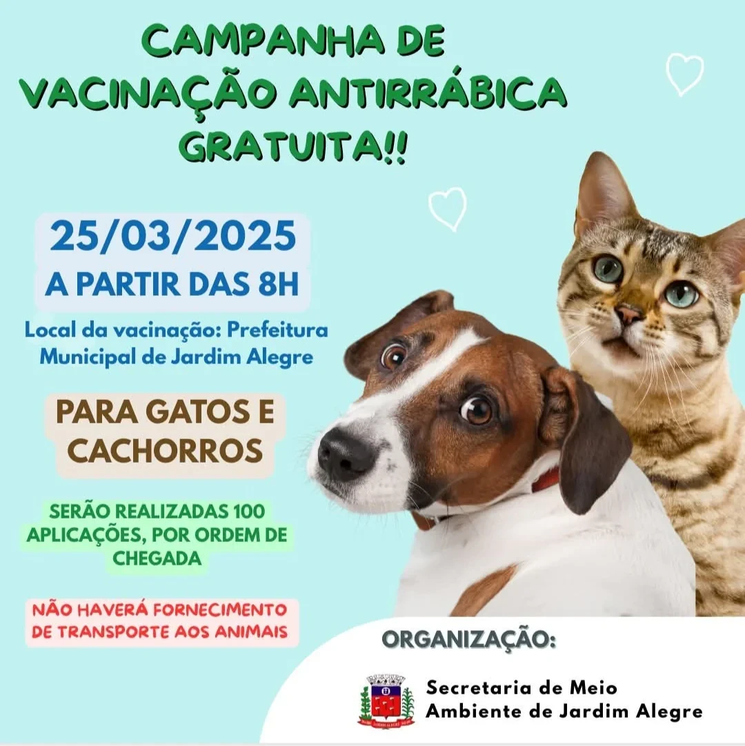 A prefeitura de Jardim Alegre convida todos os moradores a participarem da campanha, levando seus cães e gatos para receberem a vacinação gratuita. É importante ressaltar que a quantidade de doses é limitada, portanto, é recomendado que os interessados procurem a sede da prefeitura o mais breve possível para garantir a vacinação de seus animais de estimação.